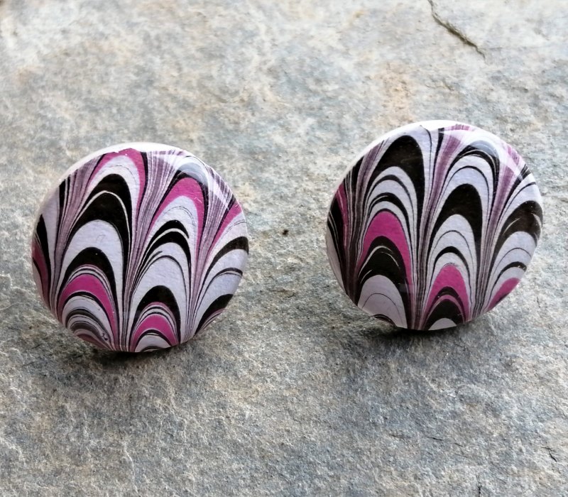 Marbled items, including silk scarves, simple notebooks, unusual paper jewelery and bold, graphic wall pieces